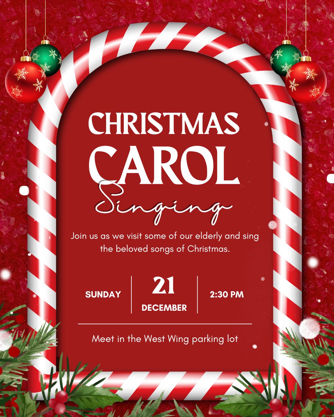 Join us for carolling on Sunday afternoon, December 21, from 2:30 – 4:30 pm as we visit some of our elderly and sing the beloved songs of Christmas.  Meet in the West parking lot at 2:30 pm.