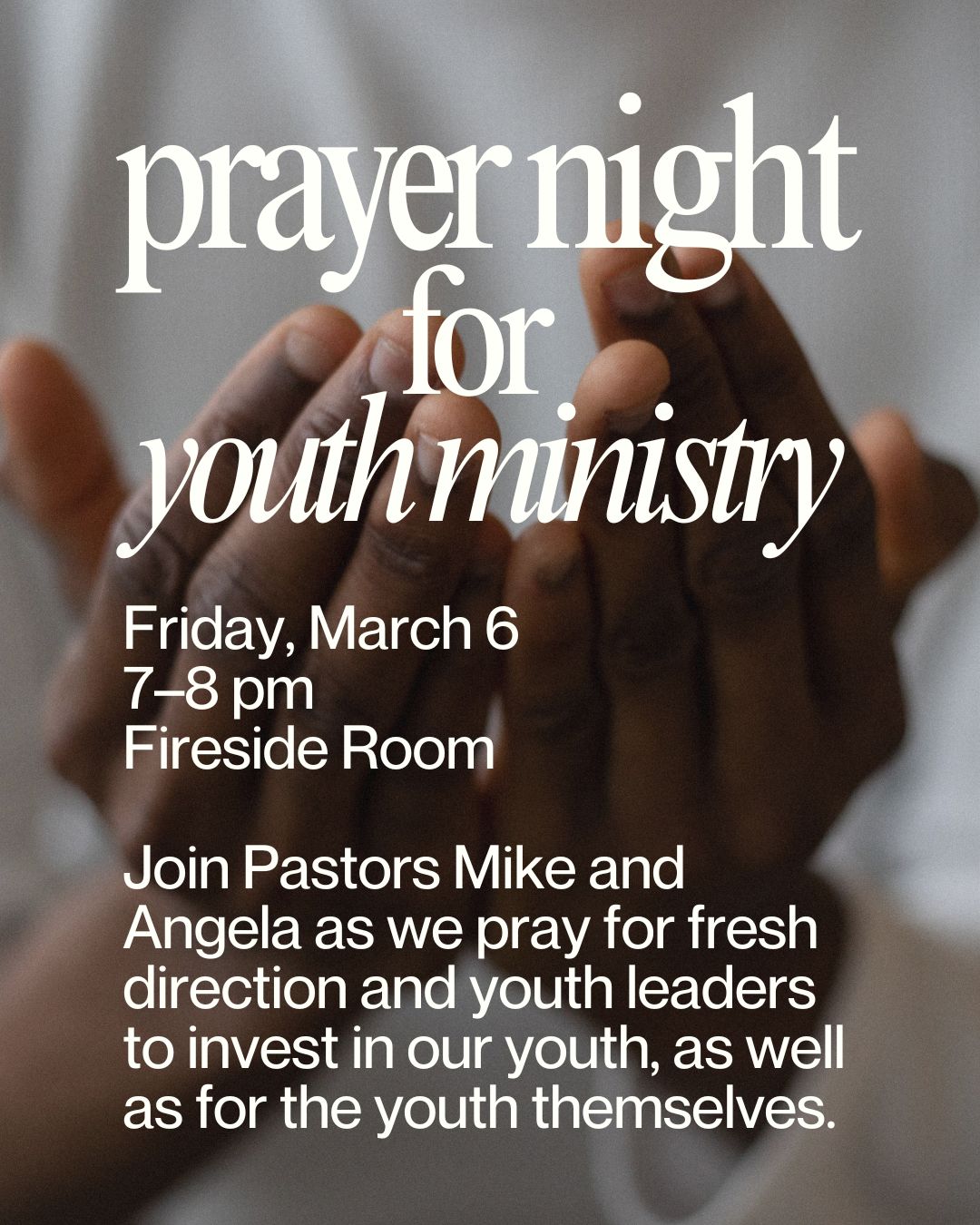 Join Pastors Mike and Angela as we pray for fresh direction and youth leaders to invest in our youth, as well as for the youth themselves. If you know of a specific need that can be shared in prayer, please send it to Mike ahead of time.