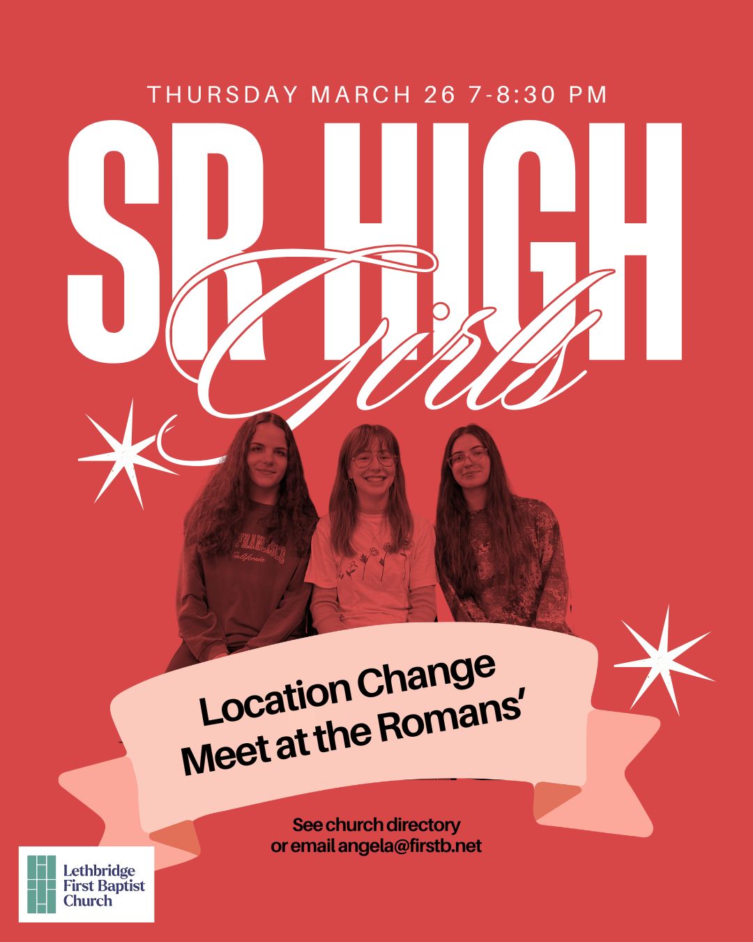 Sr. High Girls, meet at the Romans’ on Thursday at 7 pm!